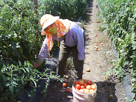 由於每天出發的時間都約為早上4點,等Bus接我們到工作的農場,到了農場,會由工頭(supervisor)發給大家當天做為辬識之用的夾子(Tag),之後就可以努力的採蕃茄,由於是以桶計算,今天的收成如何,就得看你有多努力工作了!